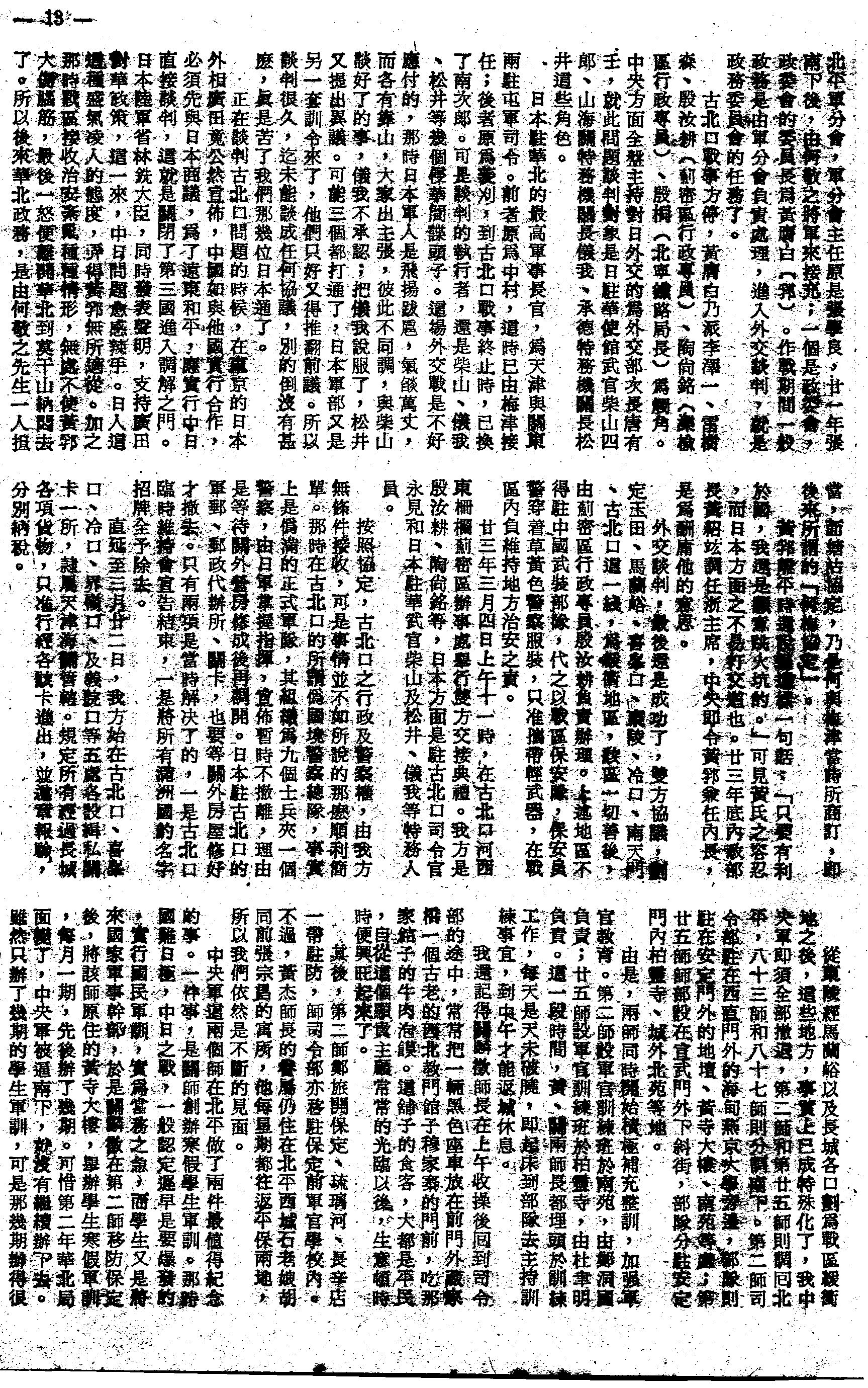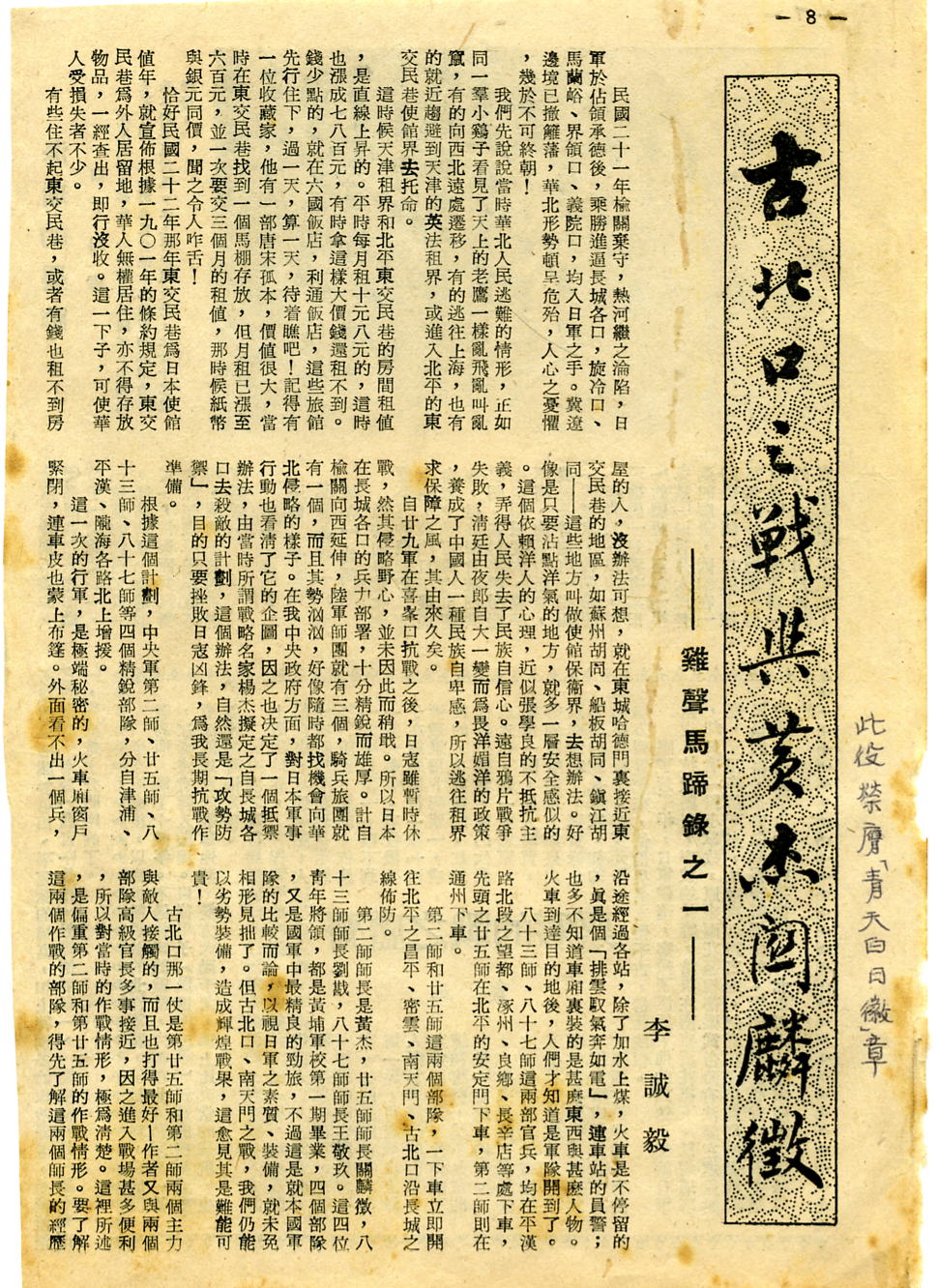 由陝西省圖書館保存之報紙 , 查閱情況看 1. 該館保存的 ﹝大公報﹞月份和天數不全 . 2. 當時正在打扙 , 為軍事保密 , 新聞報導對敵方指名道姓 , 對我方只見我軍如何如何 ---- 未公布部隊番號和指揮官姓名 . 有關古北口長城抗日戰事 . 大公報 ----- 天津版 民國 22 年 ﹝ 1933 ﹞ 4 月 6 日第三版 , 簡報 徐卅電 ----- 徐抗日後援會派趙立濤攜大批慰勞品贈 關麟徵 , 宋哲元 旗兩面 , 五日北上慰勞 . 2. 民國 22 年﹝ 1933 ﹞ 4 月 8 日 關麟徵 出院後談話 , 補充所部再赴前線 . 國聞社云 : 25 師 關師長 , 前於古北口之役 , 因負傷入 協和醫院 治療 ,己於上星期出院記者於昨日下午赴 25 師司令部訪問 命 , 以救國難 , 以雪國恥 . 因此雖蒙諸醫士迭次挽勸 , 勿輕出院 , 但余實 忍無再忍 , 不得不毅然出院矣 . 現正積極補充訓練 民國 22 年﹝ 1933 ﹞ 4 日 18 日第四版 關麟徵 昨檢閱在平駐軍定今曰赴南天鬥國聞社云 : 前在古北口禦敵負傷之 25 師師長 關麟徵 氏自傷愈出院後 , 對在平所 註 ==== 以上三則摘抄自民國 22 年﹝ 1933 ) 4 月份天津大公報 ,3 月份報紙沒有 . 故 張季鸞 先生社評及 關麟徵 住院後的慰問報 本段摘自 ﹝湘北大捷﹞一書 . 因此書破舊 , 看不見作者姓名 本書作者可從書中第一節緒言中獲悉 : 第一頁寫道 --- 為了紀念這不平凡的會戰和不平凡的勝利 , 我們各就 戰場身歷目擊的事實 , 合力寫成這本 “ 湘北大捷 ” . 我們敢一致自信在這裹面沒有強調戰況 , 更沒有抹煞真相 . ﹝從這段話中 , 可看出此書是集體創作 , 惜原書己找不到作者姓名 , 故摘此段為証 . ﹞ 第一頁寫有 : 在敵相 阿部 登台 , 敵酋 西尾板垣 來華 , 楊言將以全力解決中國事變之後 , 以素稱果敢機智的岡村甯次為對手的 湘北會戰 , 實在不是一個平凡的會戰 . 無奈遭遇箸我們最高統帥 , 以第一流殲滅聖手 關麟徵 將軍的主力 , 配上其他合手的搭擋 , 在名戰略家聯合導演下 , 與之 ﹝以上把 第一次湘北會戰 雙方交戰主要對手 , 我方主力和勝利的以然結果己經概括寫清 . ﹞ 第一頁首語 ---- “ 馬首懸新月 , 三軍氣若紅 ! 夜寒茶當酒 , 星斗落杯中 .” 這是第九集團軍的行軍歌曲 . “ 關麟徵將軍 ” 書中 139 頁張酒華文中亦曾提及 . 第十三 頁 ------ 關麟徽 將軍說得好 : “ 打仗是打學問 , 我們非精研戰略戰術和 戰史不可 . 要融會貫通 , 而後方能運用自如 這段話是戰地記者作戰地視察見到 關部 戰地軍校訓練和防地工事 實況後 關將軍 講的上段話 . 第十七頁 ------- 九月十四日 , 贛北 之戰既起 , 同時 湘北 敵軍調動亦很忙碌 . 某 戰區司令長官 薛岳 將軍及某集團軍總司令 戰 前 , 德國 名將 興登堡 元帥 , 於退休後 , 卜居 坦能堡 , 平時策杖巡行於坦能堡 附近 , 研究該處地形 , 迨大戰發生後 , 德 側擊而殲滅之 . 當命 張耀明 部隊之 趙公武 部隊擔任 磊石山 , 興旺咀 ,鹿角 , 九馬咀 , 榮家彎 , 新牆 , 姚梅洲 , 龔曰高 的守 能 擴張戰果 , 不能影響 新牆 我軍之作戰 . 另以某某等軍在某地集結 ,為全線的第二線 . 此外因為 通城 之敵不犯我 九嶺 正 時各路軍倚托 劉惕 山地全線反攻 , 將深入之敵圍擊殲滅 . 此計劃既經決定 , 即命各部隊逐 步 實 施 . ﹝以上兩段 關麟徵 知己知彼 , 有計劃地誘敵深入 , 聚而殲之為大捷埋下了 优筆 , 以后事實逐步得到印証﹞ 第三十二頁 ---- 我俘虜敵 稻葉 師團軍曹 大野次郎 供得好 : ﹝我們第六師團 ( 稻葉 師團 ) 到了 岳陽 好幾個月了 , 很早就 本 段從日俘的供詞中可以看出敵人畏 關 英名 , 稍一遲 疑 , 坐失進攻良機 , 致遭慘敗 . |